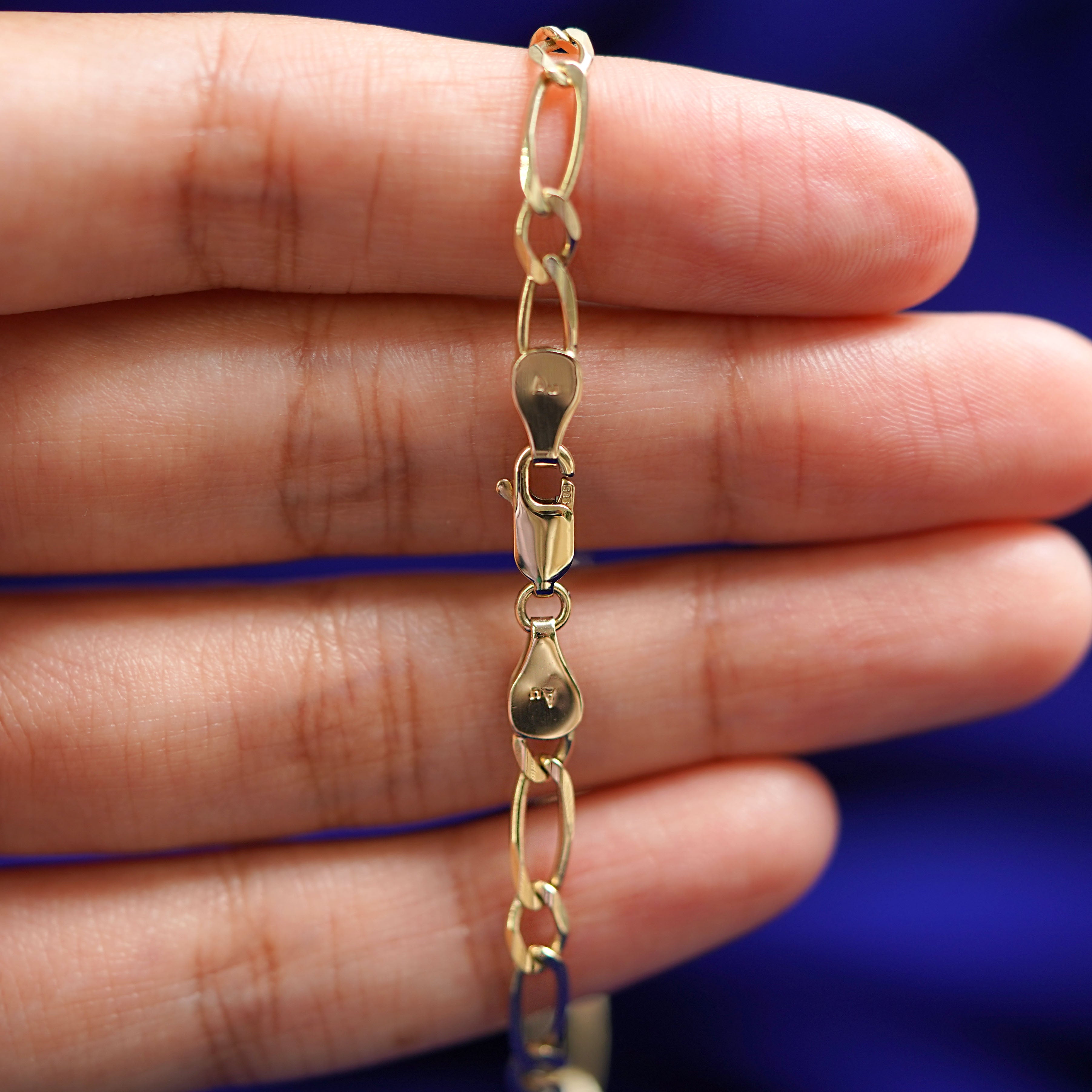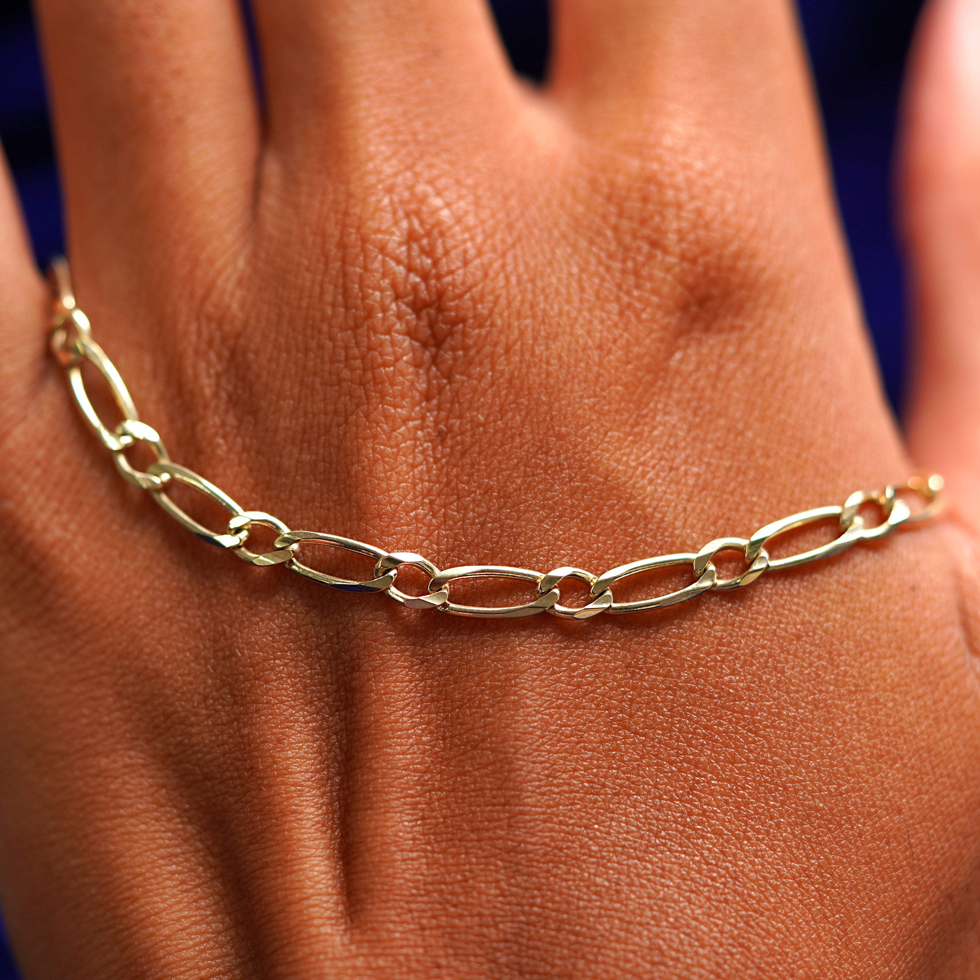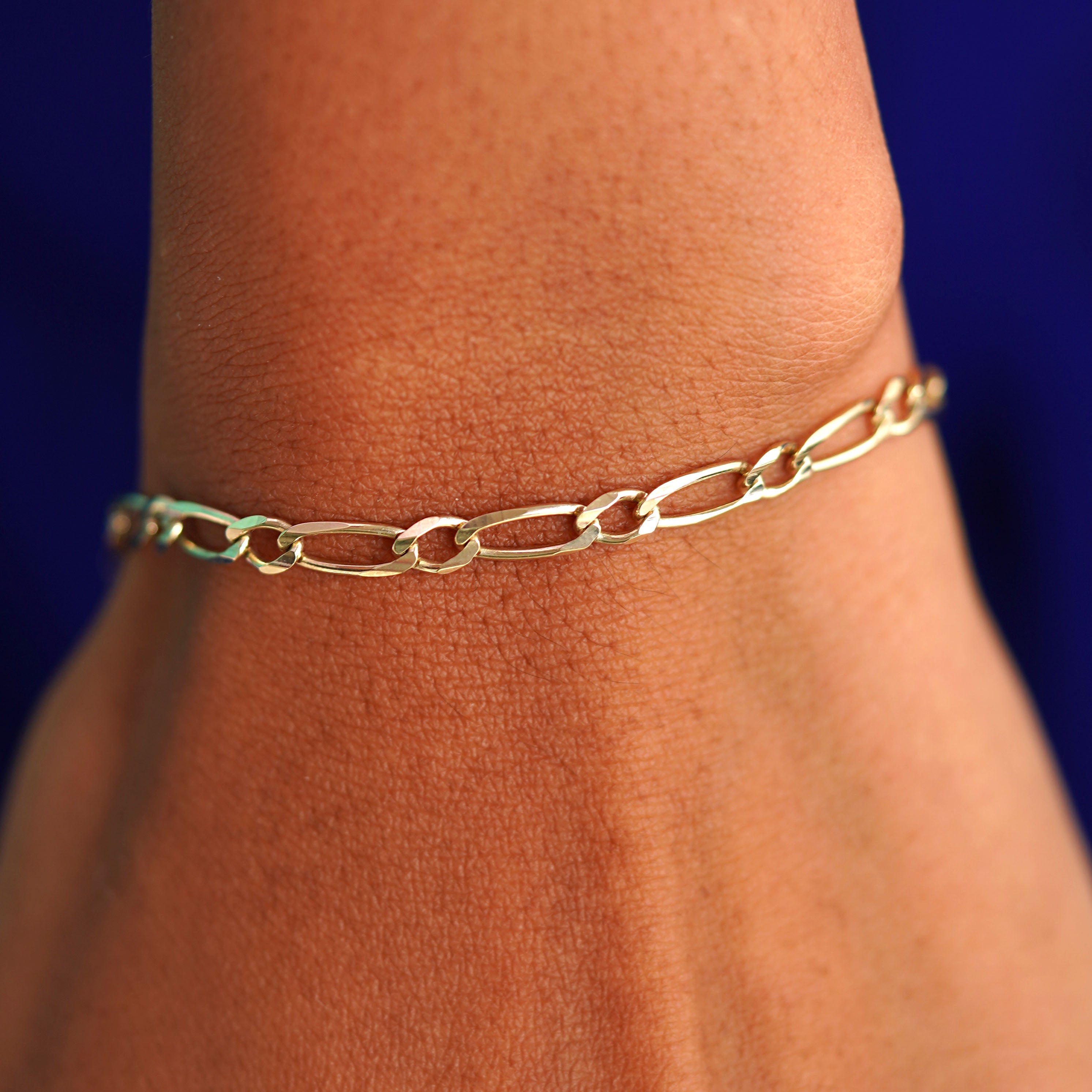 A 14 karat gold link bracelet that's a twist on the classic Figaro style, this One To One bracelet features alternating round and long links. Minimalist jewelry you can wear everyday, this modified Figaro chain bracelet is a sexy, strong, and stylish piece.