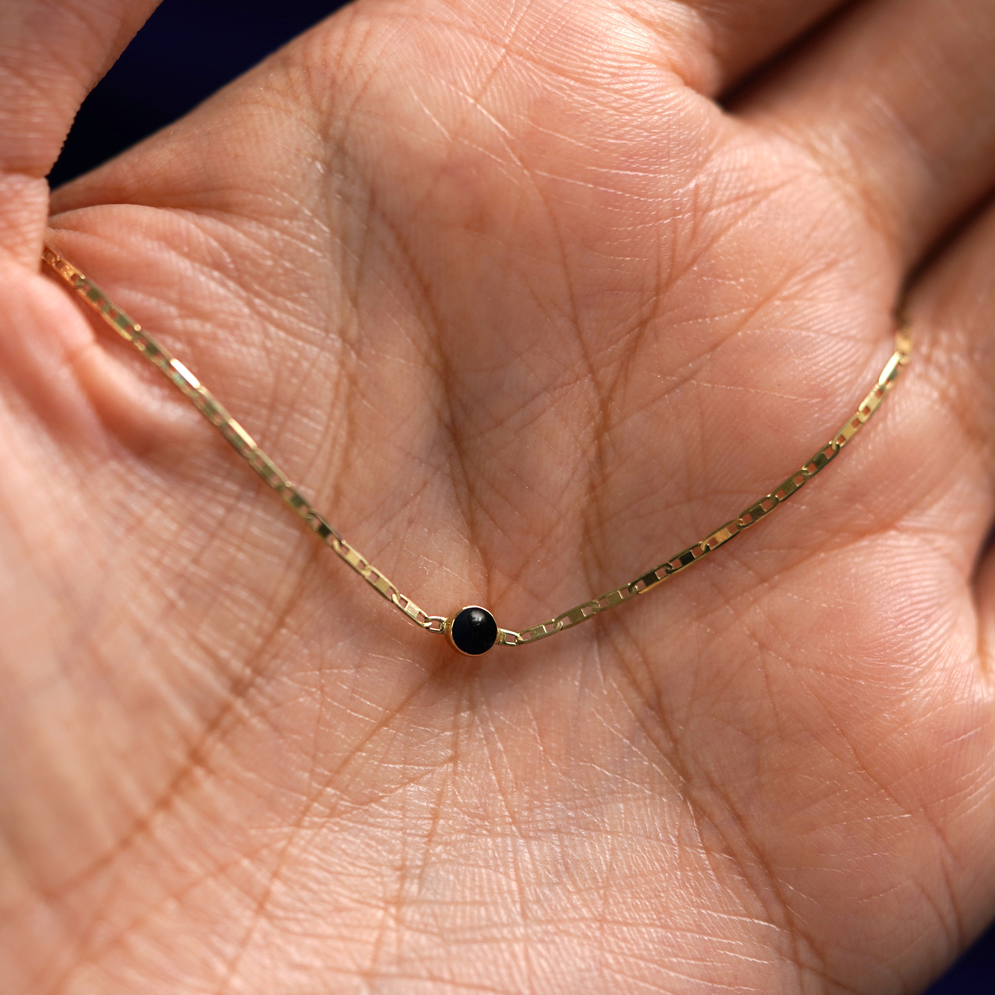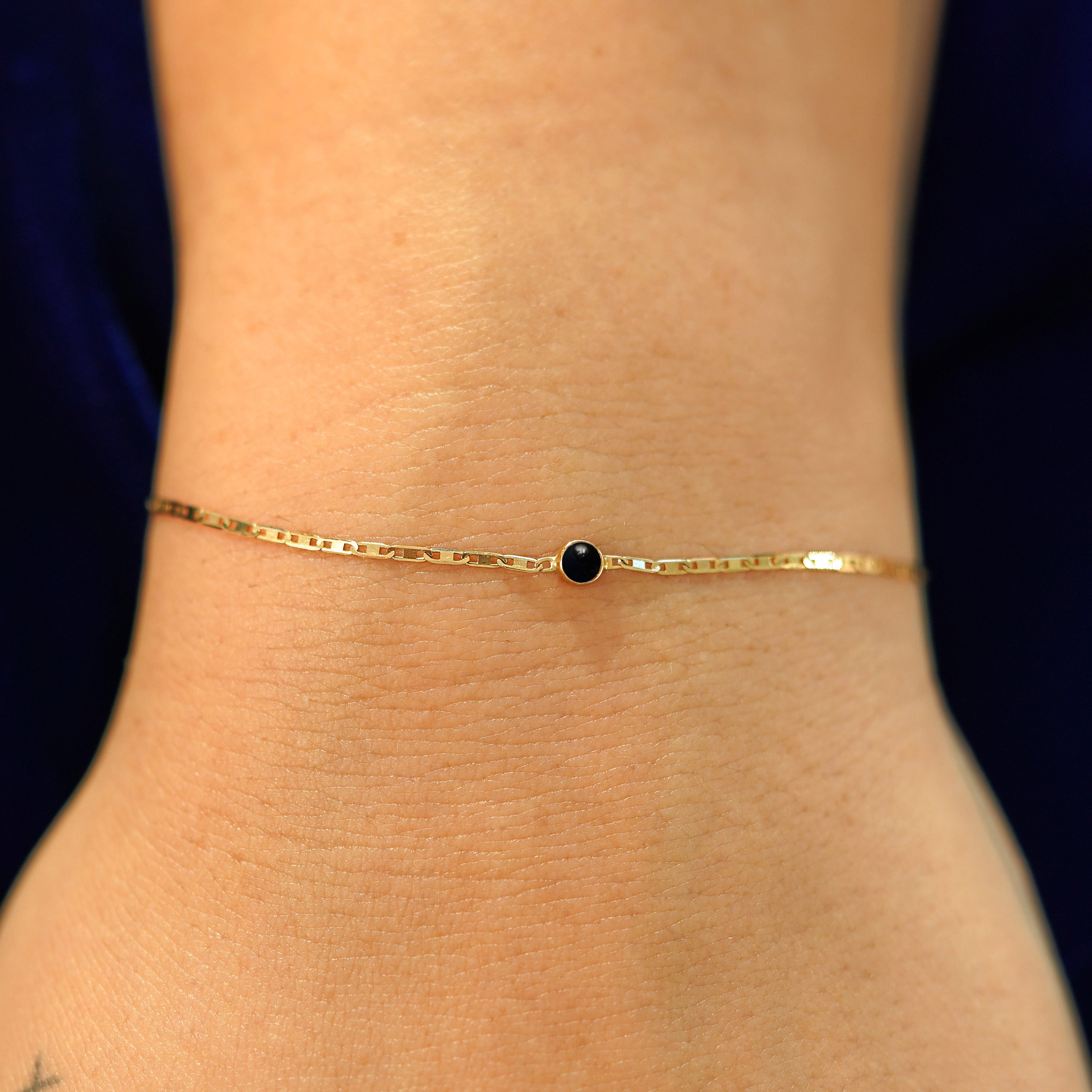 The Black Onyx is said to be a powerful protection stone. Whether you're out for the night or having a weekend in, you can wear this 14 karat gold bracelet everywhere you go. This onyx bracelet is a 14k solid gold investment that is delicate yet durable. Wear this little piece of minimalist jewelry stacked with our other gemstone bracelets for a head-turning look. The Valentine Chain secures with a lobster lock and easy-to-grip Automic Gold AU plate.