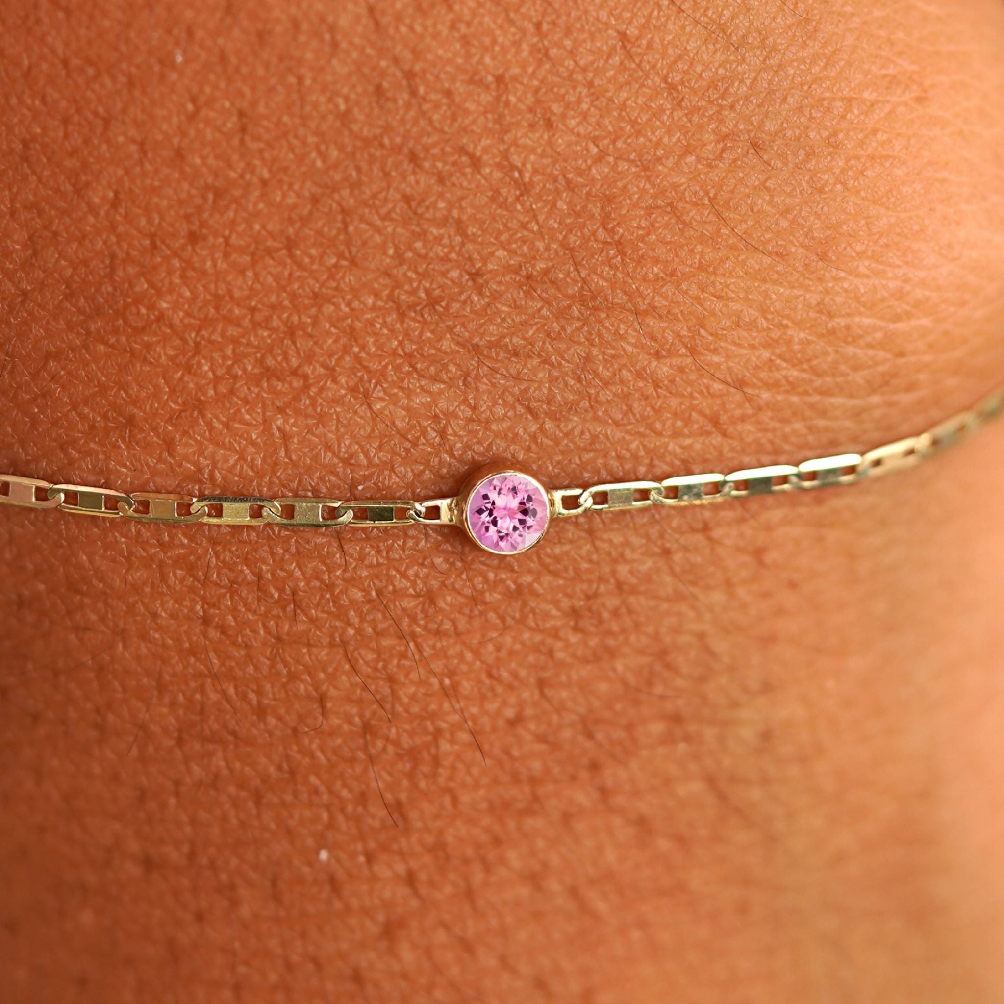 Make them blush with this beautiful pink sapphire bracelet. This ethereal 14k gold bracelet features a stunning natural pink sapphire solitaire and is perfect for stacking with our other colorful gemstone bracelets. The Valentine Chain secures with a lobster lock and easy-to-grip Automic Gold AU plate.