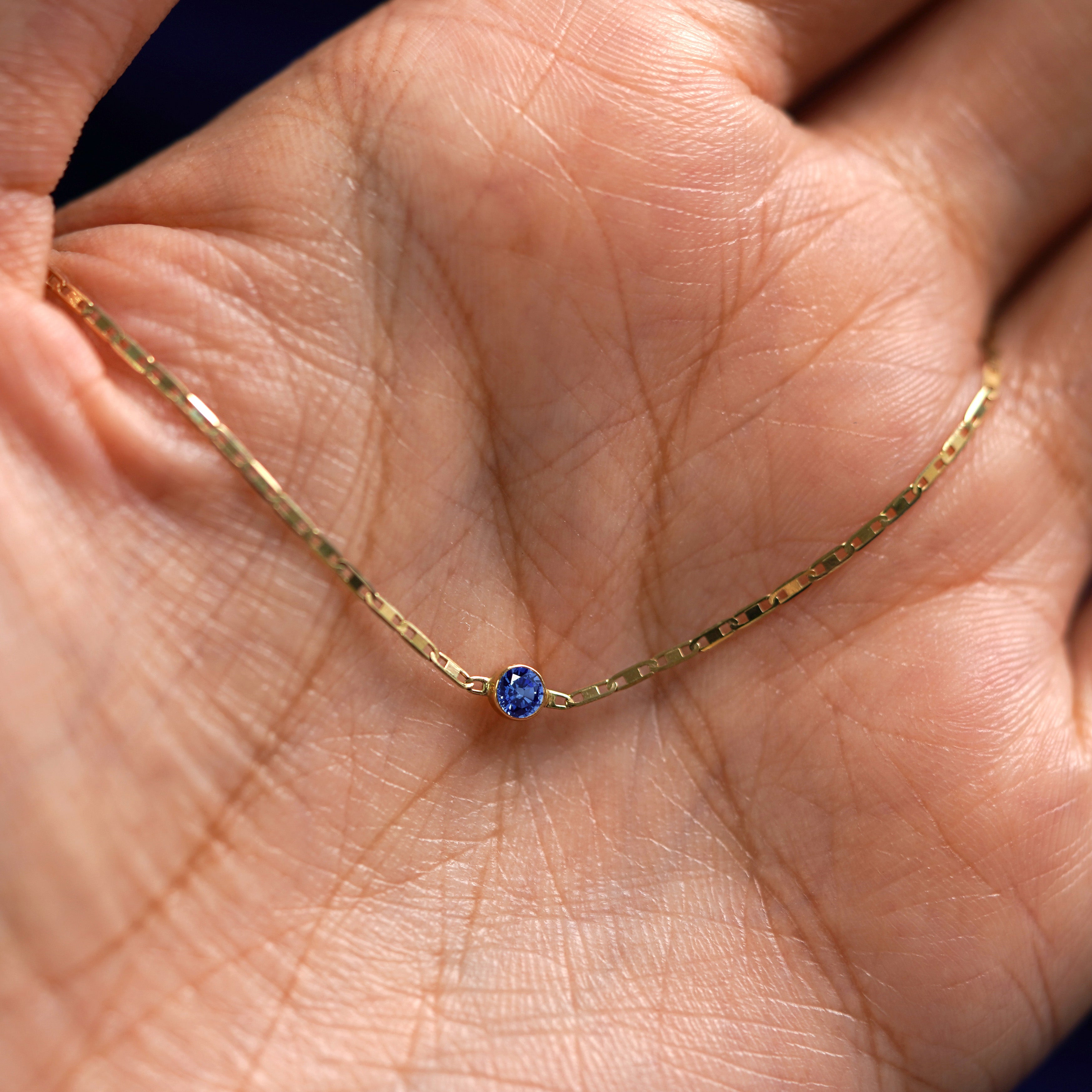 Sapphire is one of the toughest gemstones, and when you wear this sapphire bracelet, you'll feel like you can take on the world. This September birthstone bracelet features a sapphire stone on our 14k solid gold Valentine Chain. You can wear this little piece of dainty gemstone jewelry even when you're washing your hands or sleeping. Secures with a lobster lock and easy-to-grip Automic Gold AU plate.