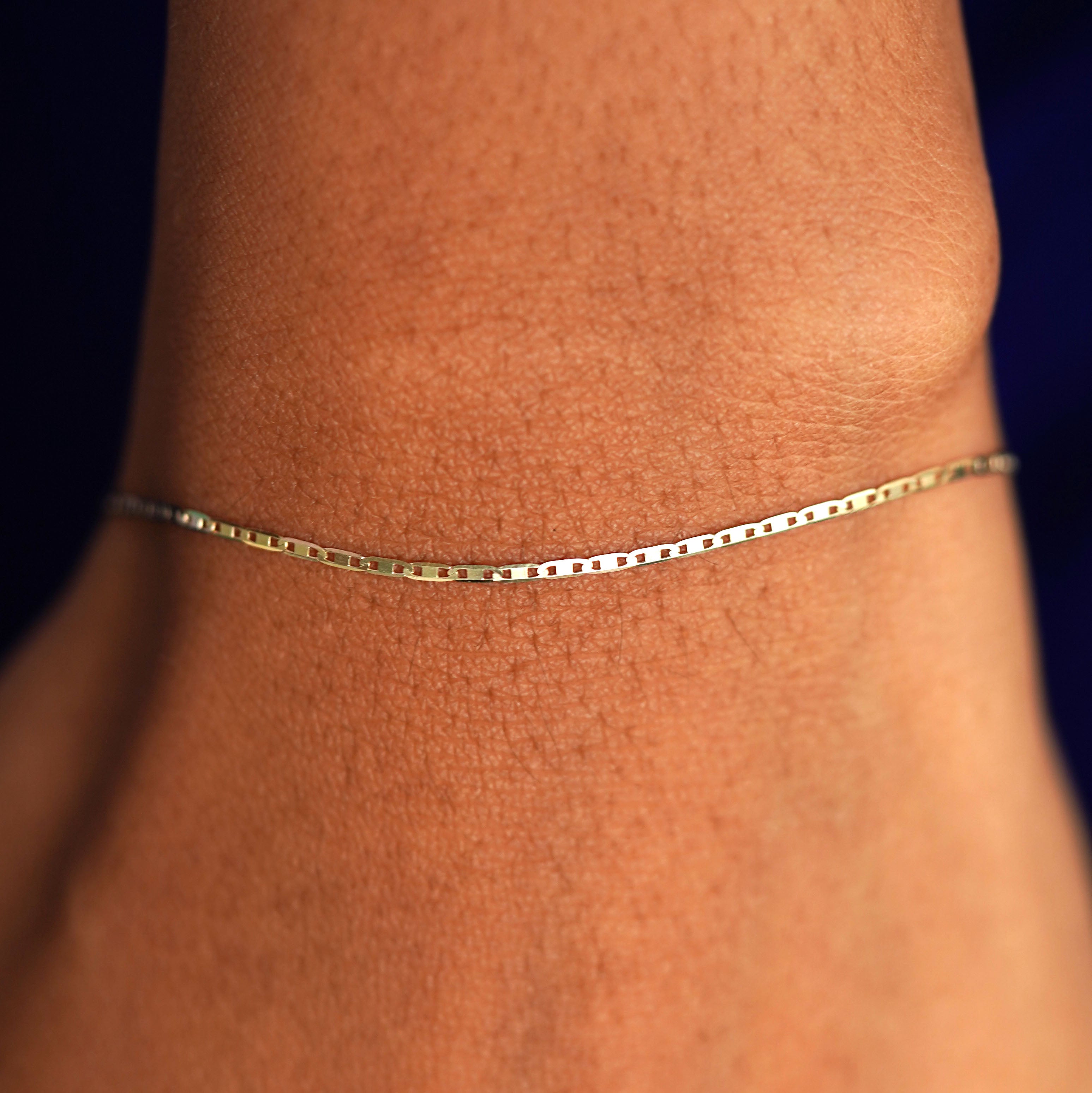 The unique design and exquisite detailing on this Valentine chain makes it the perfect piece of minimalist jewelry to enhance your style. Made from 100% recycled solid gold, this sustainable gold bracelet is both beautiful and ethical and is tested for everyday wear. A delicate gold chain with a flat and shiny appearance, this little beauty looks great alone or with our other 14 karat gold bracelets for a layered look. Secures with a spring ring clasp and easy-to-grip Automic Gold AU plate.