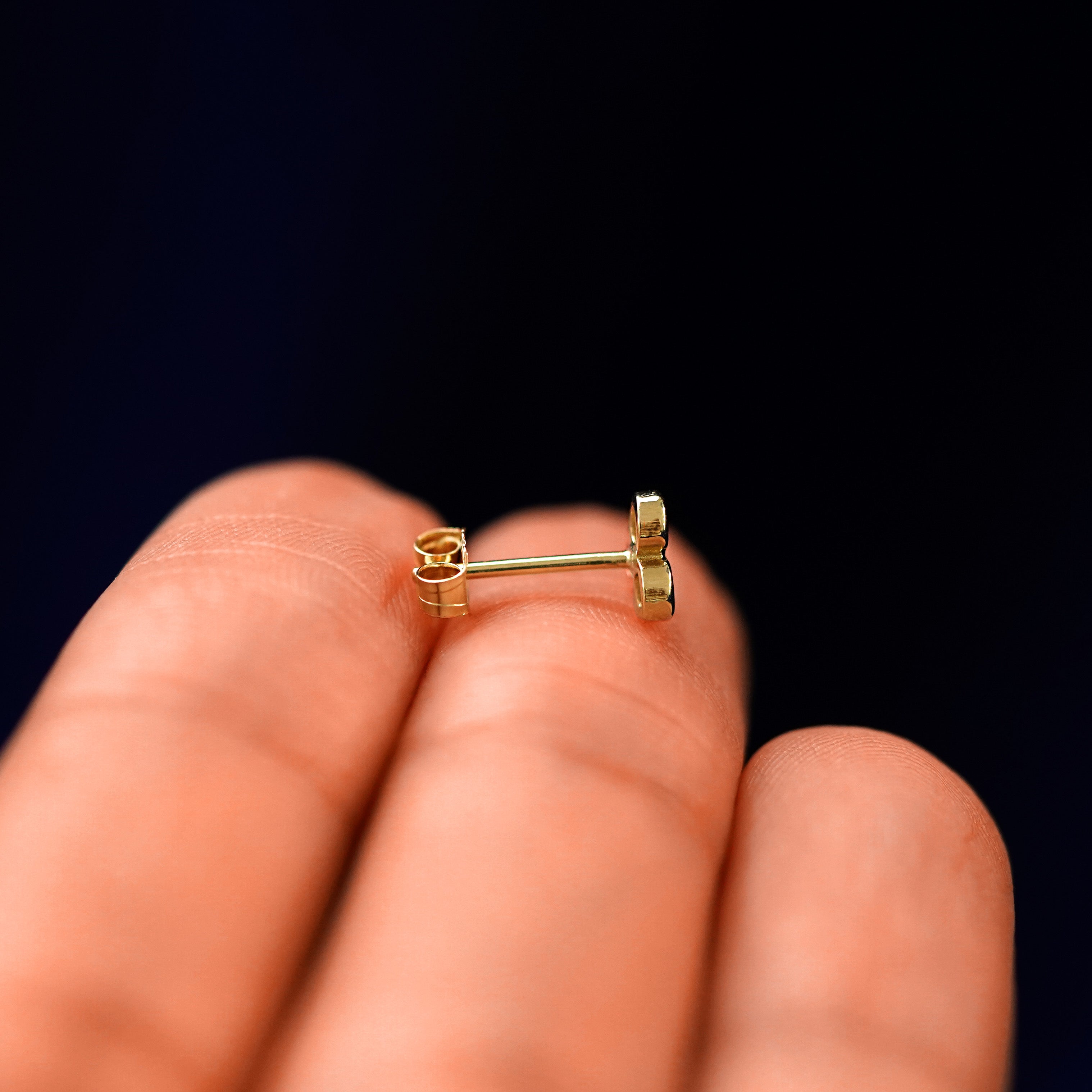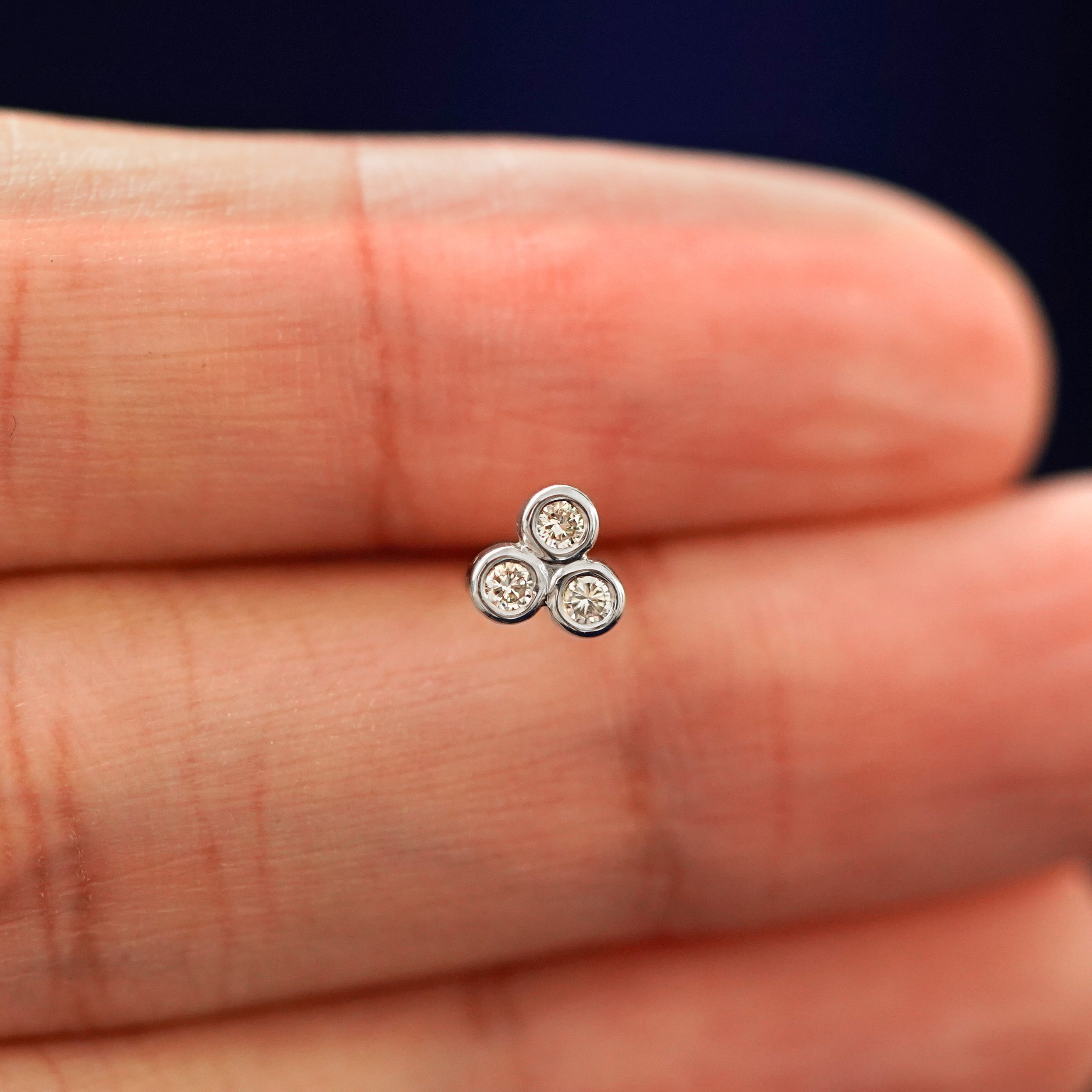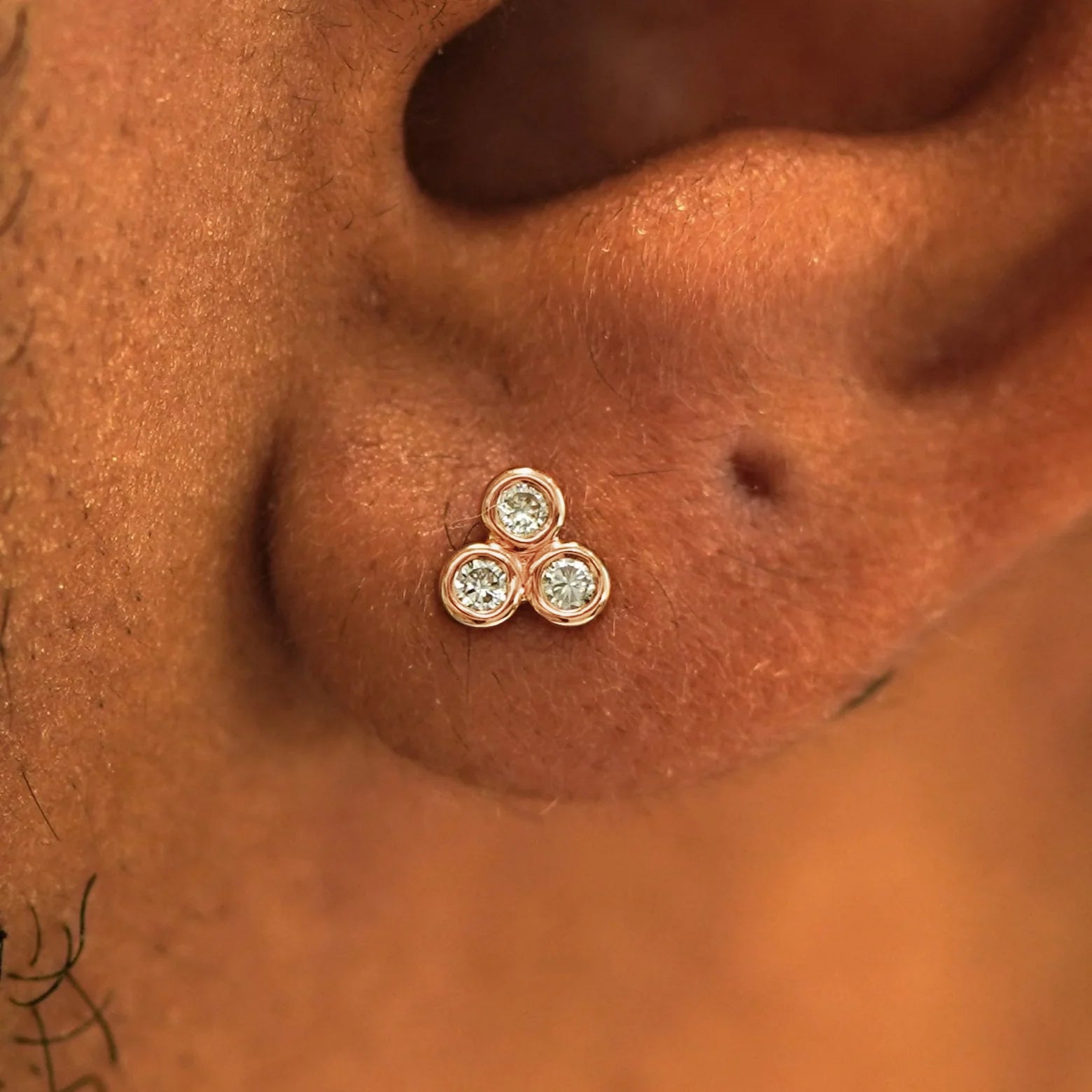 Three stones are better than one and this diamond trio earring is a sparkly dream. Three bezel-set 2mm diamonds form a gorgeous and glittering geometric pattern. Handcrafted in solid 14k gold, this little stud make is great for both a primary or secondary lobe piercing.