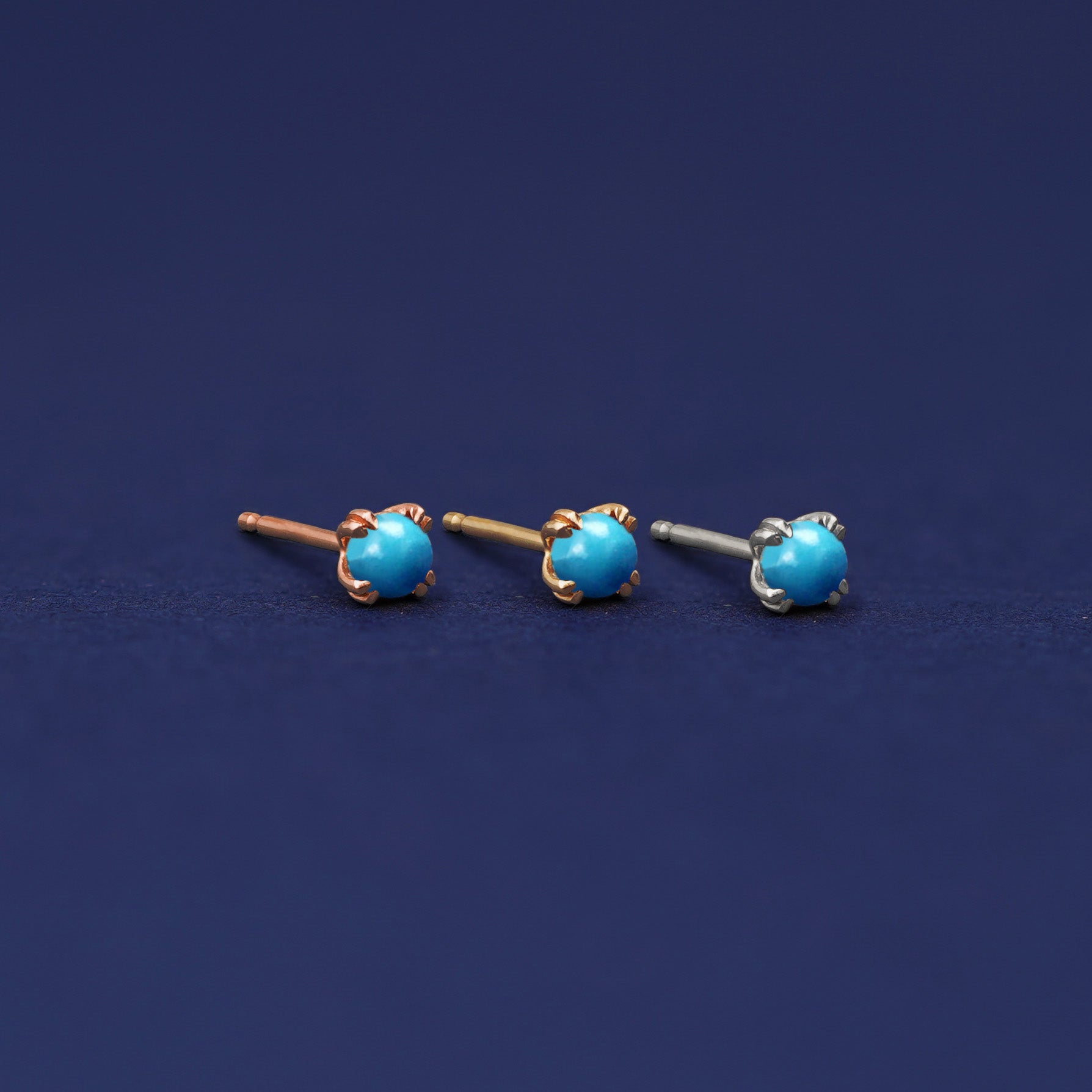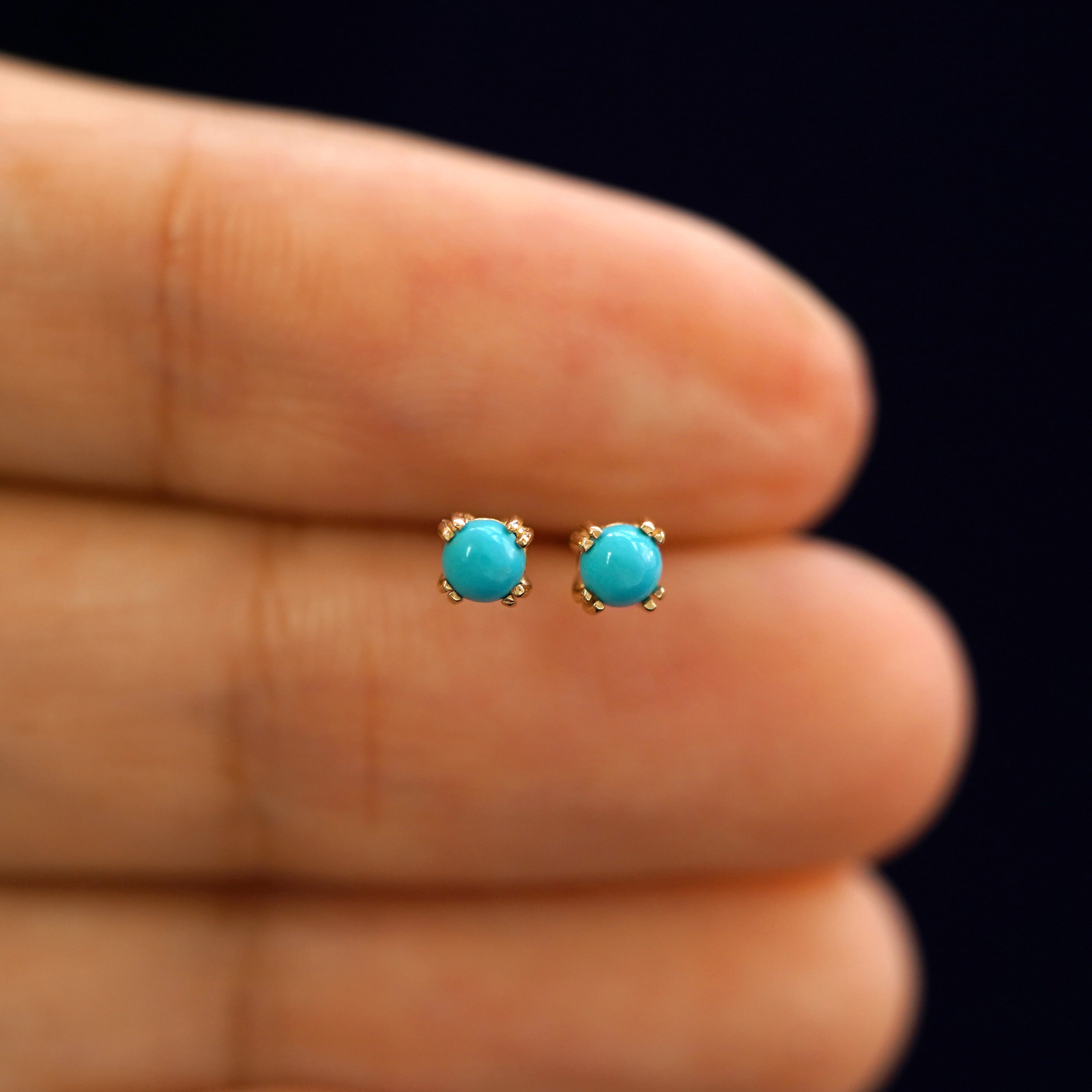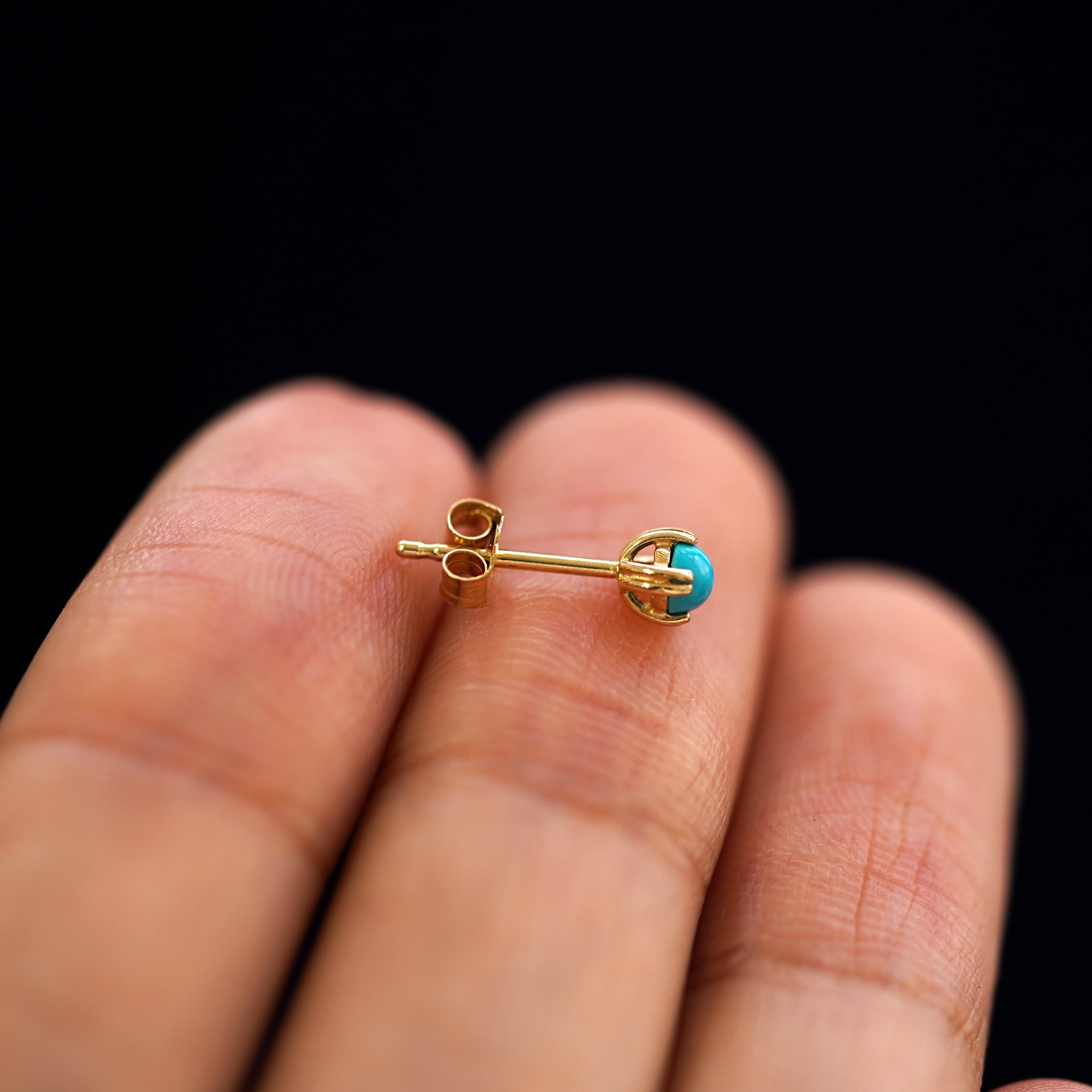 These stunning turquoise stud earrings are just the pop color you need to take your style to the next level. Turquoise is an opaque gemstone that is beloved for its beautiful green-blue color. These dainty sustainable gold earrings have cabochon shaped stones to best show off their natural beaut, for December birthstone jewelry you can wear all year round.